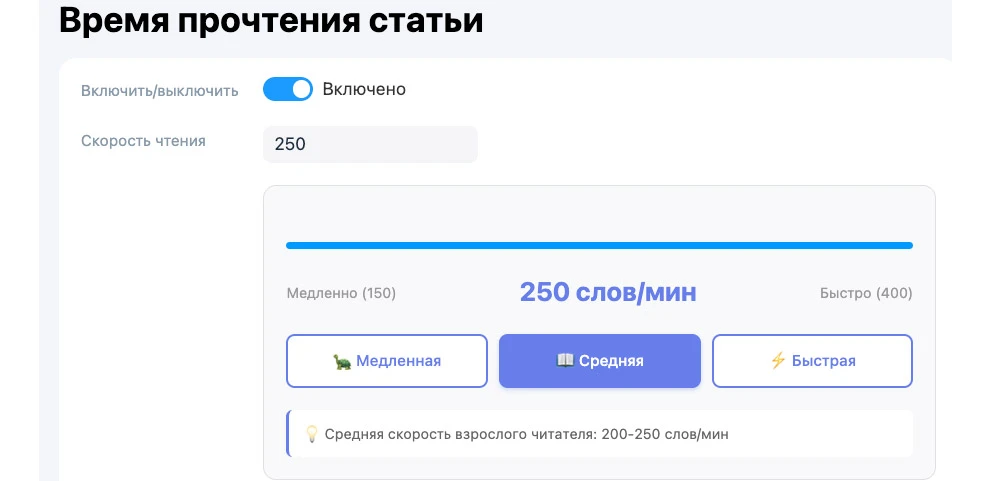 💡 Совет: Если время чтения отображается неправильно, нажмите кнопку «Пересчитать все посты» внизу страницы настроек!