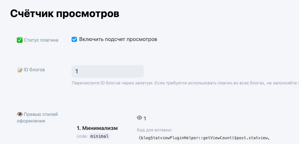 | Статус плагина | Включает/выключает подсчёт просмотров |