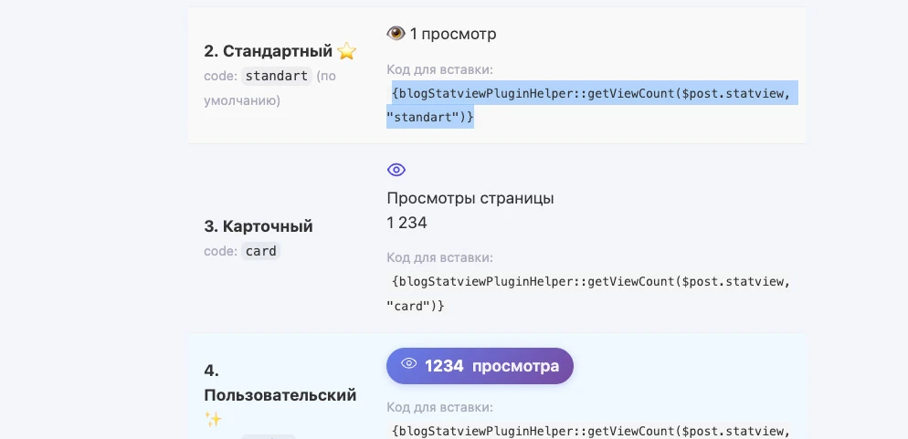 <article> <h2>{$post.title}</h2> <!-- Счётчик просмотров --> <div class="post-statview"> {blogStatviewPluginHelper::getViewCount($post.statview, 'standart')} </div> <div class="post-content"> {$post.text} </div> </article>🎨 Стили отображения